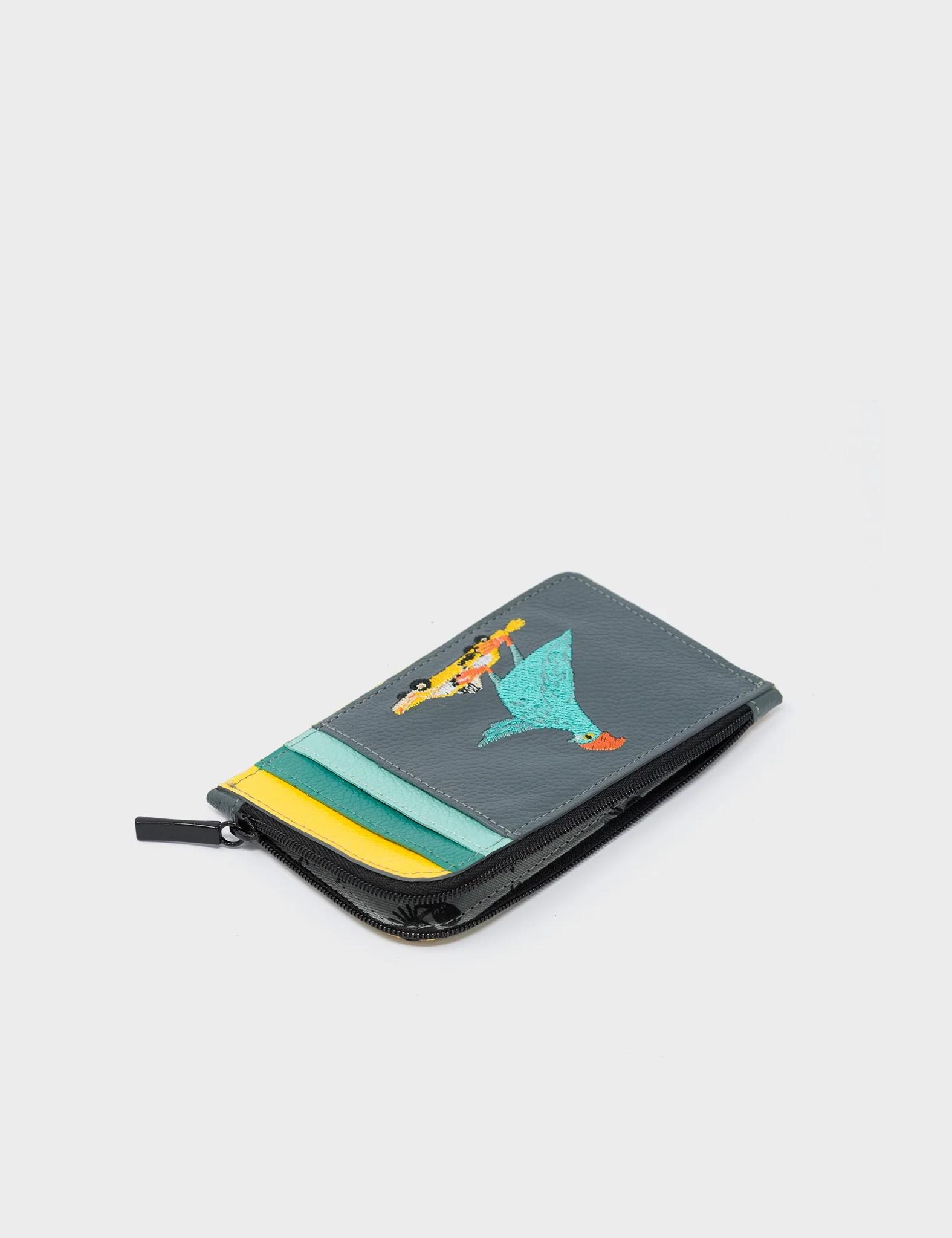 Fausto Stormy Gray Leather Zip-around Cardholder - Pigeonista Embroidery